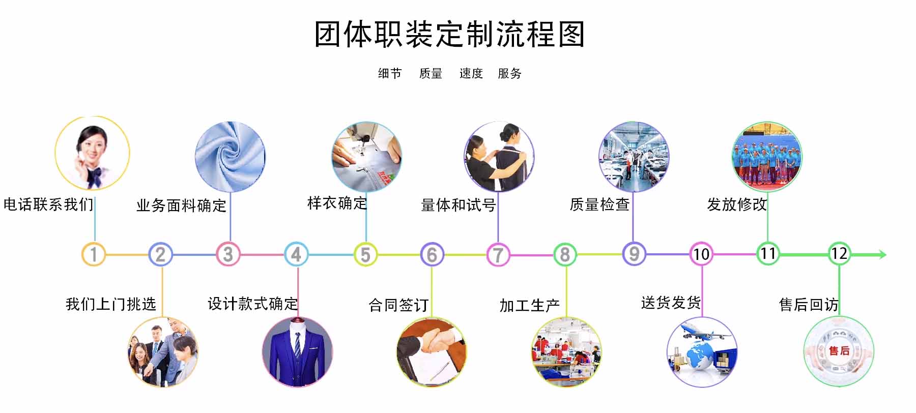 通過服務優勢、設計優勢、面料優勢、設備優勢、品質管理優勢、生產優勢等全方位制作高品質定制服裝,以此來強化對產品、品牌的體驗認知!